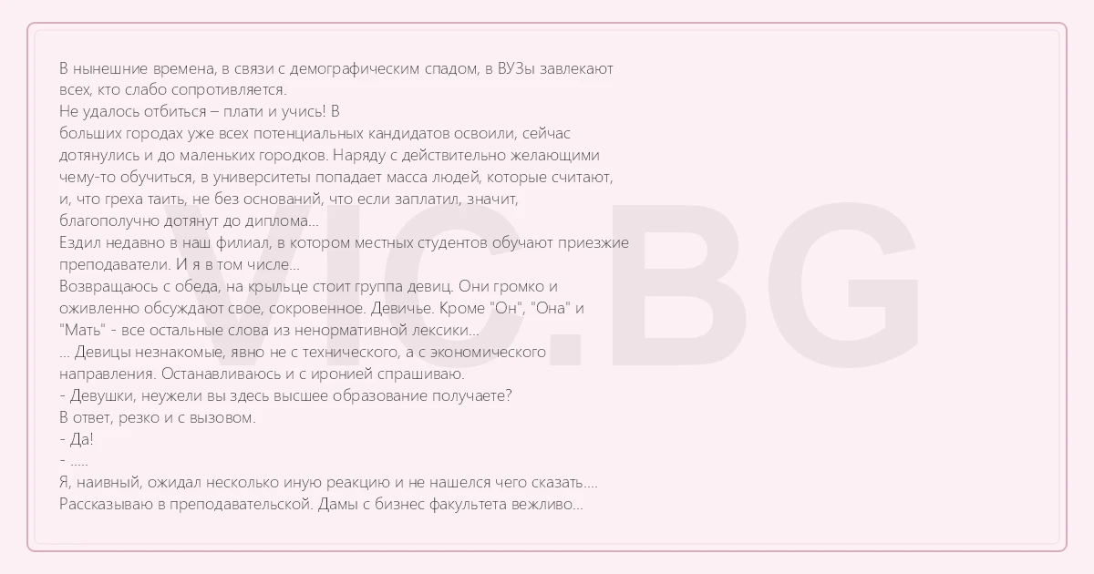 В нынешние времена, в связи с демографическим спадом, в ВУЗы завлекают всех, кто слабо сопротивляется. Не удалось отбиться – плати и учись! В больших городах уже всех потенциальных кандидатов освоили, сейчас дотянулись и до маленьких городков. Наряду с действительно желающими чему-то обучиться, в университеты попадает масса людей, которые считают, и, что греха таить, не без оснований, что если заплатил, значит, благополучно дотянут до диплома... Ездил недавно в наш филиал, в котором местных студентов обучают приезжие преподаватели. И я в том числе... Возвращаюсь с обеда, на крыльце стоит группа девиц. Они громко и оживленно обсуждают свое, сокровенное. Девичье. Кроме "Он", "Она" и "Мать" - все остальные слова из ненормативной лексики... ... Девицы незнакомые, явно не с технического, а с экономического направления. Останавливаюсь и с иронией спрашиваю. - Девушки, неужели вы здесь высшее образование получаете? В ответ, резко и с вызовом. - Да! - ..... Я, наивный, ожидал несколько иную реакцию и не нашелся чего сказать.... Рассказываю в преподавательской. Дамы с бизнес факультета вежливо поулыбались, помолчали. - Нет, нет, тут вы в корне неправы. Вас никуда не послали, не так ли? Значит, девушки действительно высшее образование получают... Плотогон