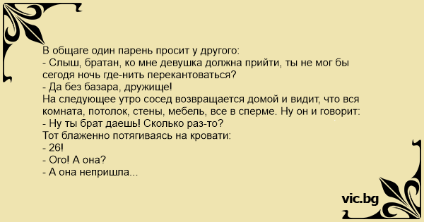 На следующее утро сосед возвращается домой и видит, что вся комната, потолок, стены, мебель, все в сперме. Ну он и говорит: