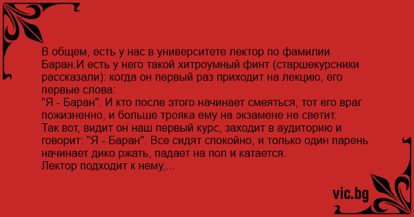 Так вот, видит он наш первый курс, заходит в аудиторию и говорит: "Я - Баран". Все сидят спокойно, и только один парень начинает дико ржать, падает на пол и катается.