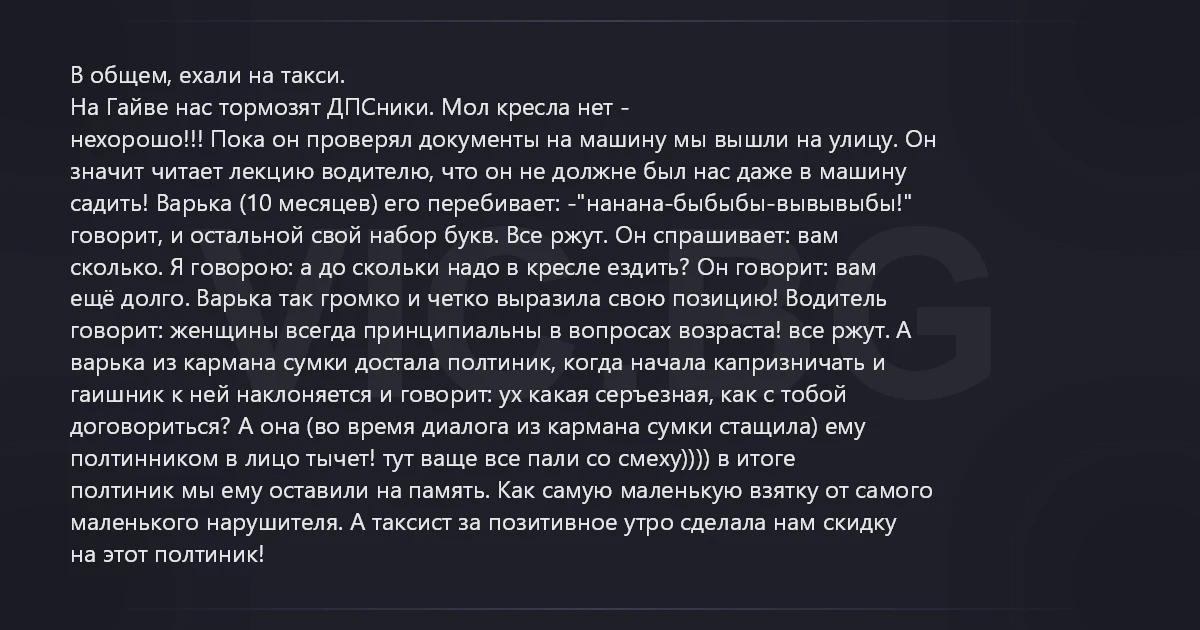 В общем, ехали на такси. На Гайве нас тормозят ДПСники. Мол кресла нет - нехорошо!!! Пока он проверял документы на машину мы вышли на улицу. Он значит читает лекцию водителю, что он не должне был нас даже в машину садить! Варька (10 месяцев) его перебивает: -"нанана-быбыбы-вывывыбы!" говорит, и остальной свой набор букв. Все ржут. Он спрашивает: вам сколько. Я говорою: а до скольки надо в кресле ездить? Он говорит: вам ещё долго. Варька так громко и четко выразила свою позицию! Водитель говорит: женщины всегда принципиальны в вопросах возраста! все ржут. А варька из кармана сумки достала полтиник, когда начала капризничать и гаишник к ней наклоняется и говорит: ух какая серъезная, как с тобой договориться? А она (во время диалога из кармана сумки стащила) ему полтинником в лицо тычет! тут ваще все пали со смеху)))) в итоге полтиник мы ему оставили на память. Как самую маленькую взятку от самого маленького нарушителя. А таксист за позитивное утро сделала нам скидку на этот полтиник!