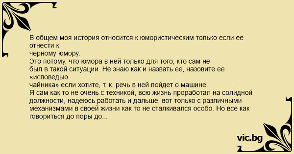 В общем моя история относится к юмористическим только если ее отнести к черному юмору. Это потому, что юмора в ней только для того, кто сам не был в такой ситуации. Не знаю как и назвать ее, назовите ее «исповедью чайника» если хотите, т. к. речь в ней пойдет о машине. Я сам как то не очень с техникой, всю жизнь проработал на солидной должности, надеюсь работать и дальше, вот только с различными механизмами в своей жизни как то не сталкивался особо. Но все как говориться до поры до времени. Все началось с того дня, когда мы (читай супруга) решили приобрести автомобиль. Я стоически сопротивлялся (как видно чувствовал) на доводы, типа зарабатываем не плохо, все вроде есть, кроме машины, а все знакомые давно уже по несколько машин поменяли и т.д. - но… в итоге пришлось сдаться. В общем решили мы остановиться на достаточно свежей девятке 2002 года, с разными как говорят сейчас наворотами в виде тонировки, литых дисков и магнитолы. Первые неприятности начались тогда -когда я сел за руль. Дело в том, что меня, если необходимо по службе обычно возит мой шофер, и права которые я получил чисто формально несколько лет назад (необходимо было для выезда за границу по обмену и один пункт включал в себя наличие водительского удостоверения, причем как оказалось -это было совсем не обязательно), короче права были - ну и ездить казалось тоже не трудно, но это только казалось. Продавец конечно видя мою мягко говоря «неопытность» проводил меня на пол пути до дома, но когда оставалось несколько улиц, пришлось ехать самому. В общем - кое как с пятого раза тронувшись я покатил в район местожительства игнорируя светофоры, т. к. боялся остановиться и вновь не с уметь тронуться с места. Первый же патруль ГАИ меня остановил и наложил штраф за езду на красный и за отсутствие страхового полиса. То что я только что купил машину и еще не получал номеров никого не смутило и мне было объяснено, что страховать транспорт надо сразу. Я не стал спорить и кое как на первой передаче покатил домой. На следующий день, я с утра пораньше, отпросившись на пару часов с работы, поехал уже с опытным водителем за рулем моей машины страховать ее. Получив страховку и еще кучу всяких бумаг (правила пользования, полисы ДТП и т. д.) я не нашел ничего лучше, как положить все в так называемый файлик. Ну не было ничего, а мять такую красивую бумагу не хотелось. Положив все аккуратно в бардачок, я облегченно вздохнул и прикинул -когда же мне теперь удобнее ехать ставить номера. Мы поехали на работу (к слову я работаю км в 10 от города), и там я пол дня учился под чутким руководством сослуживцев трогаться плавно с места и переключать скорости. Дело в принципе пошло (учусь я быстро) и к вечеру я уже достаточно созрел, что бы на мягких лапках добраться домой по окружным дорогам. В общем первый же пост ГАИ меня остановил (т. к. машина без номеров), но я уверенно протянул им этот файлик со страховкой. Да! Страховка там была, а вот ПТС и справки счет не было! Положив все в один этот долбанный файлик -я в попыхах (надо ведь было на работу) видно взял этот файлик наоборот открытым концом вниз и они (справка была аккуратно вложена в ПТС) выскользнули, когда я рысью бежал к машине (февраль месяц все таки, а я в костюме). В общем не смотря на все мои заверения, что машина куплена -ее они забрали на арест площадку и домой я вернулся на такси. До