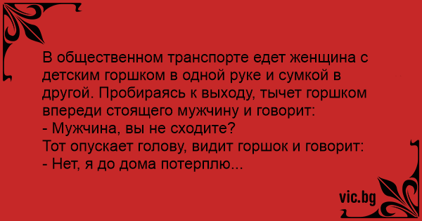 В общественном транспорте едет женщина с детским горшком в одной руке и сумкой в другой. Пробираясь к выходу, тычет горшком впереди стоящего мужчину и говорит: - Мужчина, вы не сходите? Тот опускает голову, видит горшок и говорит: - Нет, я до дома потерплю...