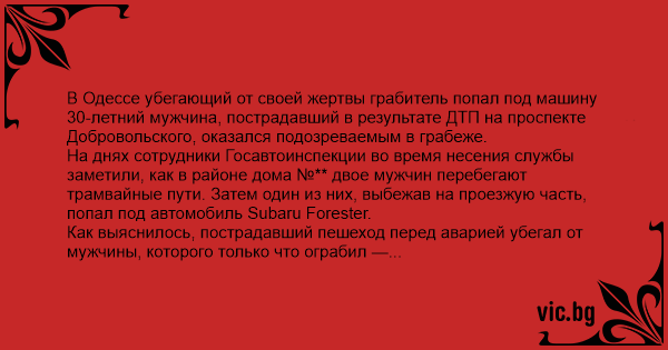 В Одессе убегающий от своей жертвы грабитель попал под машину 30-летний мужчина, пострадавший в результате ДТП на проспекте Добровольского, оказался подозреваемым в грабеже.