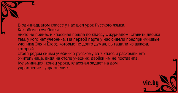 Кульминация: конец урока, классная задает на дом упражнение...упражнение