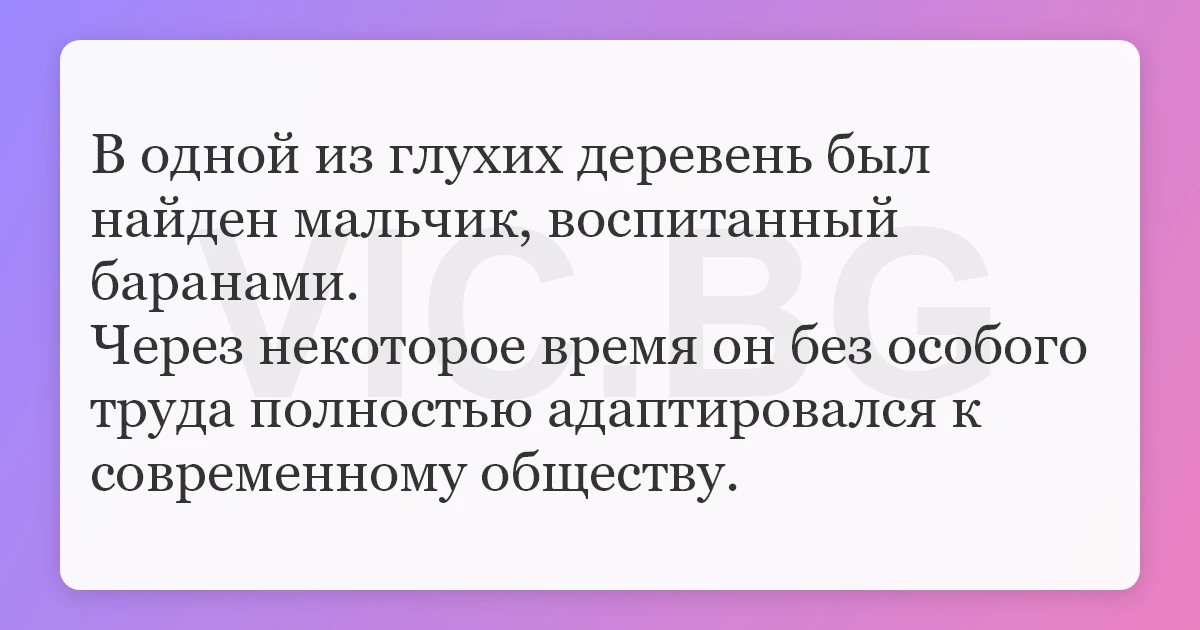 В одной из глухих деревень был найден мальчик, воспитанный баранами. Через некоторое время он без особого труда полностью адаптировался к современному обществу.