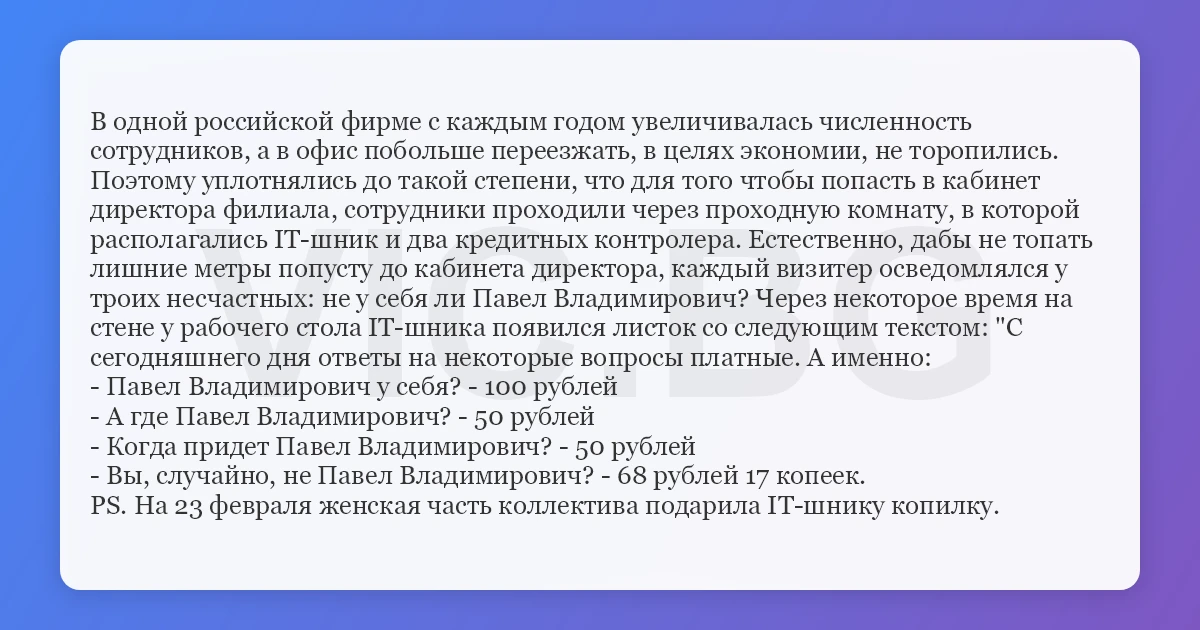 В одной российской фирме с каждым годом увеличивалась численность сотрудников, а в офис побольше переезжать, в целях экономии, не торопились. Поэтому уплотнялись до такой степени, что для того чтобы попасть в кабинет директора филиала, сотрудники проходили через проходную комнату, в которой располагались IT-шник и два кредитных контролера. Естественно, дабы не топать лишние метры попусту до кабинета директора, каждый визитер осведомлялся у троих несчастных: не у себя ли Павел Владимирович? Через некоторое время на стене у рабочего стола IT-шника появился листок со следующим текстом: "С сегодняшнего дня ответы на некоторые вопросы платные. А именно: - Павел Владимирович у себя? - 100 рублей - А где Павел Владимирович? - 50 рублей - Когда придет Павел Владимирович? - 50 рублей - Вы, случайно, не Павел Владимирович? - 68 рублей 17 копеек. PS. На 23 февраля женская часть коллектива подарила IT-шнику копилку.