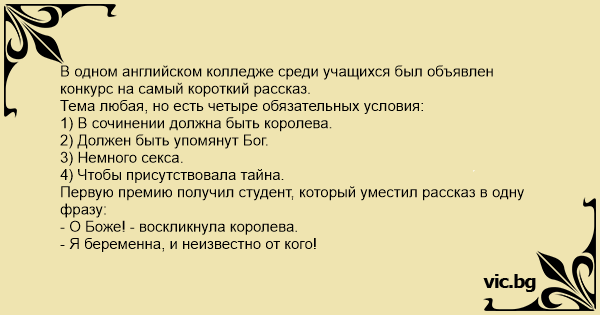 В одном английском колледже среди учащихся был объявлен конкурс на самый короткий рассказ.