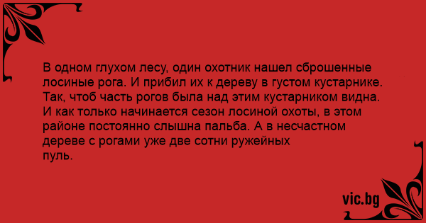 В одном глухом лесу, один охотник нашел сброшенные лосиные рога. И прибил их к дереву в густом кустарнике. Так, чтоб часть рогов была над этим кустарником видна. И как только начинается сезон лосиной охоты, в этом районе постоянно слышна пальба. А в несчастном дереве с рогами уже две сотни ружейных пуль.
