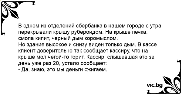 В одном из отделений сбербанка в нашем городе с утра перекрывали крышу рубероидом. На крыше печка, смола кипит, черный дым коромыслом.
