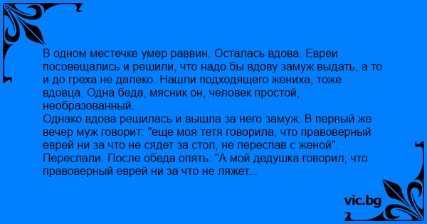 В одном местечке умер раввин. Осталась вдова. Евреи посовещались и решили, что надо бы вдову замуж выдать, а то и до греха не далеко. Нашли подходящего жениха, тоже вдовца. Одна беда, мясник он, человек простой, необразованный.