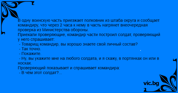 В одну воинскую часть приезжает полковник из штаба округа и сообщает командиру, что через 2 часа к нему в часть нагрянет внеочередная проверка из Министерства обороны. Приехали проверяющие, командир части построил солдат, проверяющий у него спрашивает: - Товарищ командир, вы хорошо знаете свой личный состав? - Так точно. - Покажите. - Ну, вы укажите мне на любого солдата, и я скажу, в портянках он или в носках. Проверяющий показывает и спрашивает командира: - В чём этот солдат? Командир части, ни секунды не раздумывая, уверенно докладывает: - В носках. Солдат снимает сапог - точно, на ноге у него надет носок. Проверяющий указал ещё на нескольких солдат - командир части ни разу не ошибся. Проверяющий удивился и говорит: - К нам поступил сигнал, что в вашей части плохо кормят, отведите-ка нас на кухню. Заходят в солдатскую столовую - там на обед каждому в тарелку наливают суп и кладут по полкурицы. Проверяющий удивился, пошёл в учебный класс на занятие. Приказывает командиру проверить знание теории. Командир спрашивает, что такое "строй" - лес рук. Командир части поднимает с места одного - тот отвечает идеально, и так на все вопросы. Проверяющие уехали, полковник из штаба спрашивает командира части, как это ему удалось добиться такого идеального порядка и боевой выучки. - Элементарно: приказал солдатам на правую ногу надеть носок, а на левую намотать портянку. Что я называю, то солдат проверяющему и показывает. В столовой приказал привязать к черпаку полкурицы - только накладывай. В учебном классе - кто поднимает правую руку, тот готов ответить на вопрос, кто левую - нет: я точно знаю, кого нужно спросить.