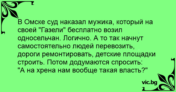 В Омске суд наказал мужика, который на своей "Газели" бесплатно возил односельчан. Логично. А то так начнут самостоятельно людей перевозить, дороги ремонтировать, детские площадки строить. Потом додумаются спросить: