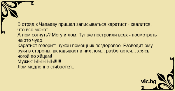 Каратист говорит: нужен помощник поздоровее. Разводит ему руки в стороны, вкладывает в них лом... разбегается... хрясь ногой по яйцам!