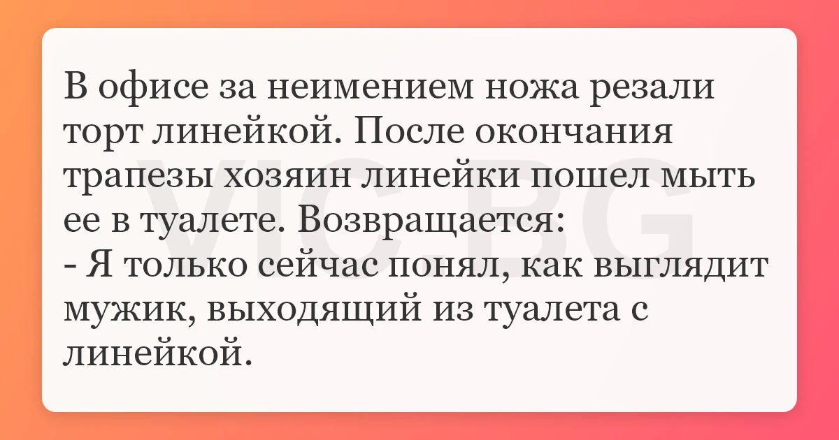 В офисе за неимением ножа резали торт линейкой. После окончания трапезы хозяин линейки пошел мыть ее в туалете. Возвращается: - Я только сейчас понял, как выглядит мужик, выходящий из туалета с линейкой.