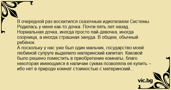 А поскольку у нас уже был один мальчик, государство моей любимой супруге выделило материнский капитал. Каковой было решено поместить в приобретение комнаты, благо некоторая имеющаяся в наличии сумма позволяла её купить – ибо нет в природе комнат стоимостью с материнский капитал.