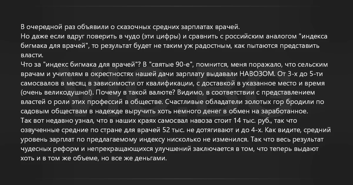 В очередной раз объявили о сказочных средних зарплатах врачей. Но даже если вдруг поверить в чудо (эти цифры) и сравнить с российским аналогом "индекса бигмака для врачей", то результат будет не таким уж радостным, как пытаются представить власти. Что за "индекс бигмака для врачей"? В "святые 90-е", помнится, меня поражало, что сельским врачам и учителям в окрестностях нашей дачи зарплату выдавали НАВОЗОМ. От 3-х до 5-ти самосвалов в месяц в зависимости от квалификации, с доставкой в указанное место и время (очень великодушно!). Почему в такой валюте? Видимо, в соответствии с представлением властей о роли этих профессий в обществе. Счастливые обладатели золотых гор бродили по садовым обществам в надежде выручить хоть немного денег в обмен на заработанное. Так вот недавно узнал, что в наших краях самосвал навоза стоит 14 тыс. руб., так что озвученные средние по стране для врачей 52 тыс. не дотягивают и до 4-х. Как видите, средний уровень зарплат по предлагаемому индексу нисколько не изменился. Так что весь результат чудесных реформ и непрекращающихся улучшений заключается в том, что теперь выдают хоть и в том же объеме, но все же деньгами.