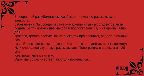 В очередной раз убеждаюсь, как бывает неудачно рассказывать анекдоты. Забегаловка. За соседним столиком компания явных студентов, чуть подальше три вояки - два майора и подполковник. Ну и студенты, явно для прикола, громко рассказывают анекдоты про военных, радостно каждый раз ржут. Видно, что вояки надуваются злостью, но сделать ничего не могут. Ну и очередной студиозус рассказывает: Телеграмма в военкомат - 28 мне уже, поцелуйте меня в ж. Один майор резко встает, аж стул опрокинулся. Ну, думаю, вот и драка будет. Но он становится по стойке смирно, откидывает руку, и хорошо поставленным командирским голосом декламирует: - Для любителей в же целоваться Существует мобилизация! После чего спокойно садится на место. Все ржут, студиозусы быстро допивают пиво и уходят. А говорят, у военных нет чувства юмора...