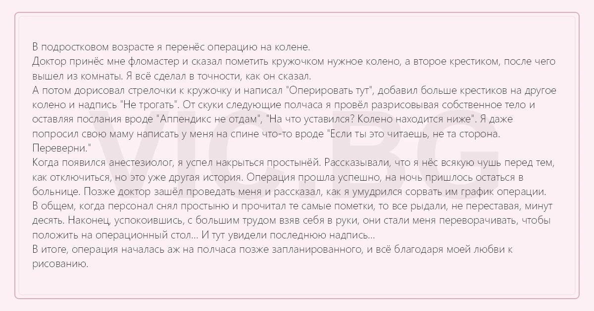 В подростковом возрасте я перенёс операцию на колене. Доктор принёс мне фломастер и сказал пометить кружочком нужное колено, а второе крестиком, после чего вышел из комнаты. Я всё сделал в точности, как он сказал. А потом дорисовал стрелочки к кружочку и написал "Оперировать тут", добавил больше крестиков на другое колено и надпись "Не трогать". От скуки следующие полчаса я провёл разрисовывая собственное тело и оставляя послания вроде "Аппендикс не отдам", "На что уставился? Колено находится ниже". Я даже попросил свою маму написать у меня на спине что-то вроде "Если ты это читаешь, не та сторона. Переверни." Когда появился анестезиолог, я успел накрыться простынёй. Рассказывали, что я нёс всякую чушь перед тем, как отключиться, но это уже другая история. Операция прошла успешно, на ночь пришлось остаться в больнице. Позже доктор зашёл проведать меня и рассказал, как я умудрился сорвать им график операции. В общем, когда персонал снял простыню и прочитал те самые пометки, то все рыдали, не переставая, минут десять. Наконец, успокоившись, с большим трудом взяв себя в руки, они стали меня переворачивать, чтобы положить на операционный стол... И тут увидели последнюю надпись... В итоге, операция началась аж на полчаса позже запланированного, и всё благодаря моей любви к рисованию.