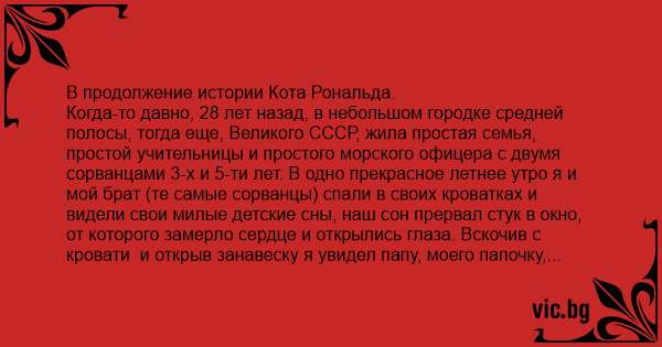И вот сегодня спустя ровно 15 лет после смерти отца, в том же доме что и 28 лет назад, я и мой младший брат встретились после 10 лет разлуки. Я достал из сумки бутылку водки, а он поставил на стол банку-Лимонные дольки мармелад в сахаре. Когда вошла мама и наши жены, то увидели-как два здоровых парня - один капитан юстиции, второй машинист первого класса-сыновья, отцы и мужья, прошедшие горячие точки, практически рыдая, жуют мармелад… И хоть это был день памяти отцу, но за этот смех мы их конечно же безоговорочно простили...