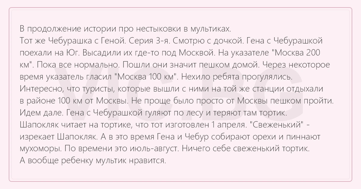 В продолжение истории про нестыковки в мультиках. Тот же Чебурашка с Геной. Серия 3-я. Смотрю с дочкой. Гена с Чебурашкой поехали на Юг. Высадили их где-то под Москвой. На указателе "Москва 200 км". Пока все нормально. Пошли они значит пешком домой. Через некоторое время указатель гласил "Москва 100 км". Нехило ребята прогулялись. Интересно, что туристы, которые вышли с ними на той же станции отдыхали в районе 100 км от Москвы. Не проще было просто от Москвы пешком пройти. Идем дале. Гена с Чебурашкой гуляют по лесу и теряют там тортик. Шапокляк читает на тортике, что тот изготовлен 1 апреля. "Свеженький" - изрекает Шапокляк. А в это время Гена и Чебур собирают орехи и пиннают мухоморы. По времени это июль-август. Ничего себе свеженький тортик. А вообще ребенку мультик нравится.