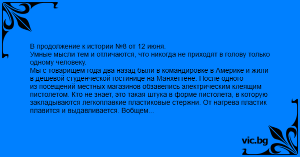 В продолжение к истории №8 от 12 июня. Умные мысли тем и отличаются, что никогда не приходят в голову только одному человеку. Мы с товарищем года два назад были в командировке в Америке и жили в дешевой студенческой гостинице на Манхеттене. После одного из посещений местных магазинов обзавелись электрическим клеящим пистолетом. Кто не знает, это такая штука в форме пистолета, в которую закладываются легкоплавкие пластиковые стержни. От нагрева пластик плавится и выдавливается. Вобщем иногда бывает полезно. Приобрести приобрели, а дальше нужно же испытать. Так как клеить было нечего, решили приколоться над местными попкорноедами. Приклеить монетку к полу в коридоре не представлялось возможным по чисто технической причине - на всех полах ковровое покрытие. Из затруднения вышли, приклеев квотер (25 центов) в лифте. Ну дальше как и полагается бедные американские студентики пытались ее отколупать, мы пару раз проехались в лифте, чтобы понаблюдать за процессом вблизи, после чего все это надоело и мы разошлись по своим делам. Но как оказалось это было еще не все. Когда где-то через час мы выходя из гостиницы спускались в лифте, монетки уже не было, что вобщем не так уж и удивительно. Интересно было то, что вместе с ней исчез и изрядный кусок пола. Кто обогатился за наш счет и чем было проведено столь аккуратное отделение квотера от пола так и осталось загадкой, но для себя я с тех пор понял, что значит американская железная хватка когда дело касается денег.