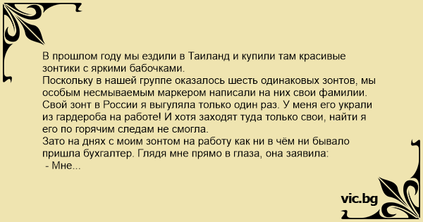 Зато на днях с моим зонтом на работу как ни в чём ни бывало пришла бухгалтер. Глядя мне прямо в глаза, она заявила: