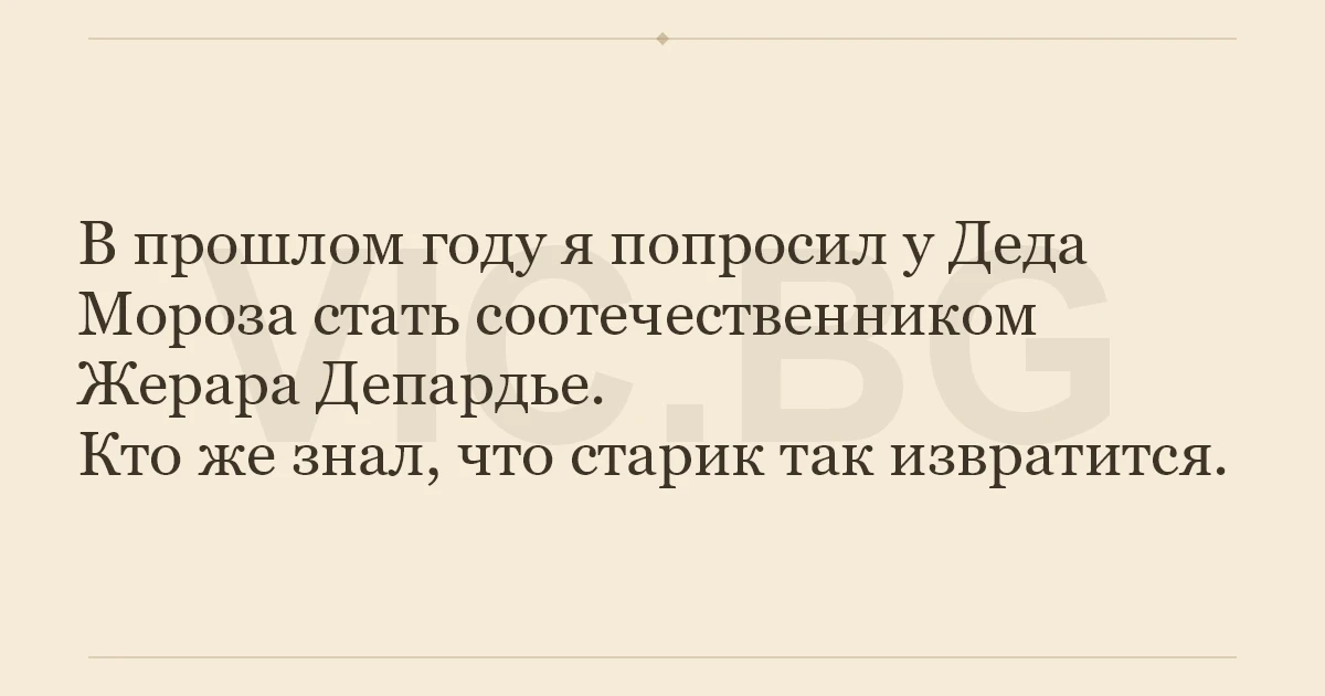 В прошлом году я попросил у Деда Мороза стать соотечественником Жерара Депардье. Кто же знал, что старик так извратится.