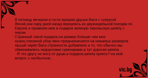 -Вот че ты прикалываешся,включил обиду Вася,шляпа отличная,просто у меня с ней ассоциации плохие,а если тебе не подходит,то подари кому нибудь,все таки полтинник евро отдал за неё,почти весь доход за фотосессию...Такие друзья…