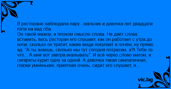 Он такой мажор, в плохом смысле слова. Не даёт слова вставить, весь ресторан его слушает, как он работает с утра до ночи, сколько он тратит, какие вещи покупает и почём, ну прямо ад. "А ты знаешь, сколько мы тут сегодня потратим, а?! Тебе-то что... А мне вот завтра вкалывать". И всё через слово матом, и сигареты курит одну за одной. А девочка такая симпатичная, глазки умненькие, приятная очень, сидит его слушает, и такая тоска у неё в глазах... А он с темы на тему скачет, активно жестикулирует и попутно к ней подбирается, чтобы её покритиковать. Дескать, туфли у тебя отстойные, кто сейчас такие носит (кстати, туфли у неё были очень даже ок), и сама ты не очень интересная, жалко мне тебя, и всё такое.