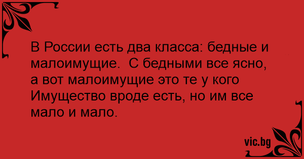 В России есть два класса: бедные и малоимущие. С бедными все ясно, а вот малоимущие это те у кого Имущество вроде есть, но им все мало и мало.