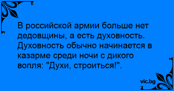 В российской армии больше нет дедовщины, а есть духовность. Духовность обычно начинается в казарме среди ночи с дикого вопля: "Духи, строиться!".