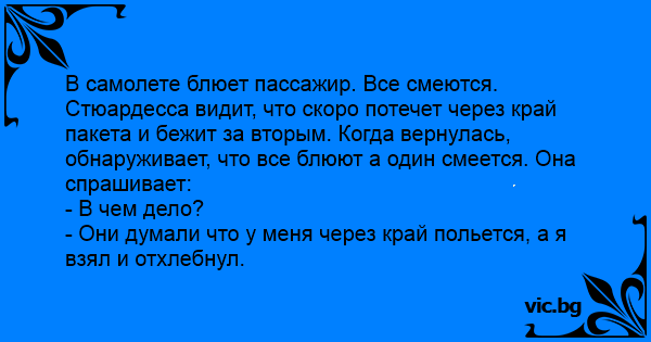 В самолете блюет пассажир. Все смеются. Стюардесса видит, что скоро потечет через край пакета и бежит за вторым. Когда вернулась, обнаруживает, что все блюют а один смеется. Она спрашивает: