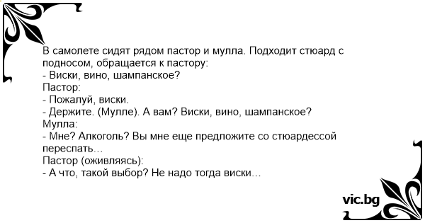 В самолете сидят рядом пастор и мулла. Подходит стюард с подносом, обращается к пастору: