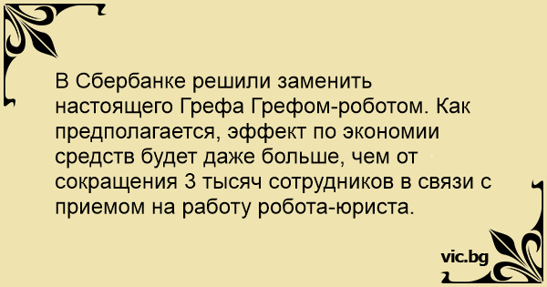 В Сбербанке решили заменить настоящего Грефа Грефом-роботом. Как предполагается, эффект по экономии средств будет даже больше, чем от сокращения 3 тысяч сотрудников в связи с приемом на работу робота-юриста.
