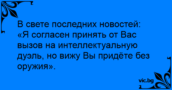 «Я согласен принять от Вас вызов на интеллектуальную дуэль, но вижу Вы придёте без оружия».