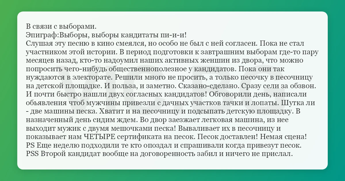 В связи с выборами. Эпиграф:Выборы, выборы кандитаты пи-и-и! Слушая эту песню в кино смеялся, но особо не был с ней согласен. Пока не стал участником этой истории. В период подготовки к завтрашним выборам где-то пару месяцев назад, кто-то надоумил наших активных женшин из двора, что можно попросить чего-нибудь общественнополезное у кандидатов. Пока они так нуждаются в электорате. Решили много не просить, а только песочку в песочницу на детской площадке. И польза, и заметно. Сказано-сделано. Сразу сели за обзвон. И почти быстро нашли двух согласных кандидатов! Обговорили день, написали обьявления чтоб мужчины привезли с дачных участков тачки и лопаты. Шутка ли - две машины песка. Хватит и на песочницу и подсыпать детскую площадку. В назначенный день сидим ждем. Во двор заезжает легковая машина, из нее выходит мужик с двумя мешочками песка! Вываливает их в песочницу и показывает нам ЧЕТЫРЕ сертификата на песок. Песок доставлен! Немая сцена! PS Еще неделю подходили те кто опоздал и спрашивали когда привезут песок. PSS Второй кандидат вообще на договоренность забил и ничего не прислал.