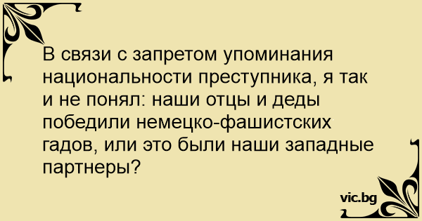 В связи с запретом упоминания национальности преступника, я так и не понял: наши отцы и деды победили немецко-фашистских гадов, или это были наши западные партнеры?