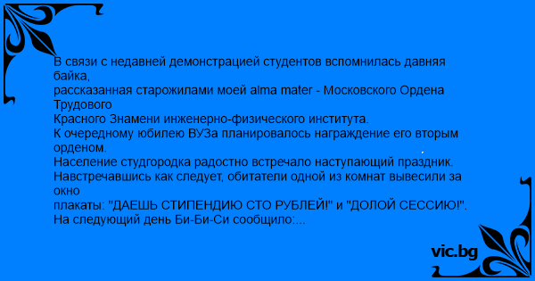 В связи с недавней демонстрацией студентов вспомнилась давняя байка, рассказанная старожилами моей alma mater - Московского Ордена Трудового Красного Знамени инженерно-физического института.