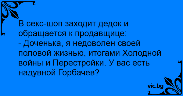 - Доченька, я недоволен своей половой жизнью, итогами Холодной войны и Перестройки. У вас есть надувной Горбачев?
