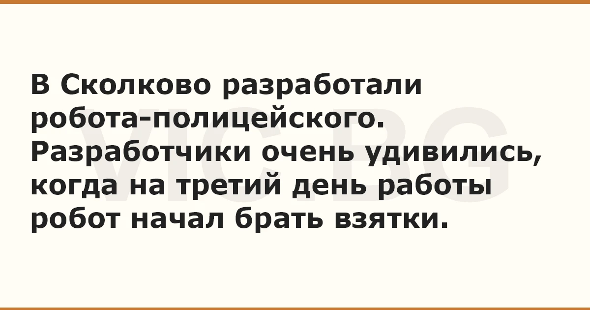 В Сколково разработали робота-полицейского. Разработчики очень удивились, когда на третий день работы робот начал брать взятки.