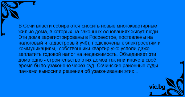 Эти дома зарегистрированы в Росреестре, поставлены на налоговый и кадастровый учёт, подключены к электросетям и коммуникациям, собственники квартир уже успели даже заплатить годовой налог на недвижимость. Объединяет эти дома одно - строительство этих домов так или иначе в своё время было узаконено через суд. Сочинские районные суды пачками выносили решения об узаконивании этих объектов. Сейчас эти же самые суды так же пачками выносят решения о незаконности этих домов якобы по "вновь открывшимся или новым обстоятельствам". Какие же это обстоятельства? Ну наверное то, что свободная для строительства земля в Сочи практически закончилась и многие уже занятые участки земли сейчас поистине "золотые" и стоят многие десятки миллионов рублей. И вот в крае принят закон, что тот, кто снесёт "приговорённый" дом - получит земельный участок, на котором этот дом находится.