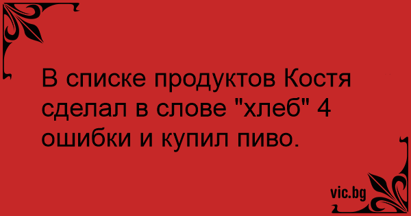 В списке продуктов Костя сделал в слове "хлеб" 4 ошибки и купил пиво.