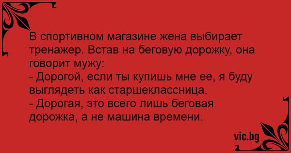 В спортивном магазине жена выбирает тренажер. Встав на беговую дорожку, она говорит мужу: