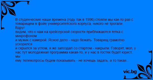 В студенческие наши времена (году так в 1996) стояли мы как-то раз с товарищем в фойе университетского корпуса, никого не трогали.