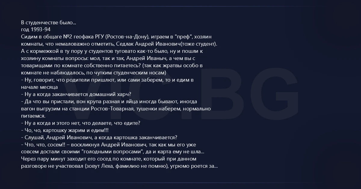 В студенчестве было... год 1993-94 Сидим в общаге №2 геофака РГУ (Ростов-на-Дону), играем в "преф", хозяин комнаты, что немаловажно отметить, Седлак Андрей Иванович(тоже студент). А с кормежкой в ту пору у студентов туговато как-то было, ну и пошли к хозяину комнаты вопросы: мол, так и так, Андрей Иваныч, а чем вы с товарищами по комнате собственно питаетесь? (так как жратвы особо в комнате не наблюдалось, по чутким студенческим носам) - Ну, говорит, что родители пришлют, или сами заберем, то и едим в начале месяца - Ну а когда заканчивается домашний харч? - Да что вы пристали, вон крупа разная и яйца иногда бывают, иногда вагон выгрузим на станции Ростов-Товарная, тушенки наберем, нормально питаемся. - Ну а когда и этого нет, что делаете, что едите? - Чо, чо, картошку жарим и едим!!! - Слушай, Андрей Иванович, а когда картошка заканчивается? - Что, что, сосем!! – воскликнул Андрей Иванович, так как мы его уже совсем достали своими "голодными вопросами", да и карта ему не шла... Через пару минут заходит его сосед по комнате, который при данном разговоре не участвовал (зовут Леха, фамилию не помню), угрюмо роется за перегородками в шкафах и злобно-голодно-похмельным голосом выдает: - Седлак, бл@дь, а ты в курсе, что у нас картошка заканчивается? Простите, ребята, если кого-то обидел, Геофак Forever!!! С Уважением, Мельников О. А.