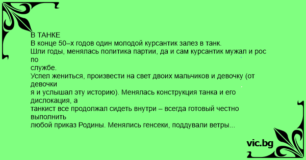 В ТАНКЕ В конце 50–х годов один молодой курсантик залез в танк. Шли годы, менялась политика партии, да и сам курсантик мужал и рос по службе. Успел жениться, произвести на свет двоих мальчиков и девочку (от девочки я и услышал эту историю). Менялась конструкция танка и его дислокация, а танкист все продолжал сидеть внутри – всегда готовый честно выполнить любой приказ Родины. Менялись генсеки, поддували ветры перемен, началась и развалилась вместе с Советским Союзом перестройка, наступили безумные 90-е, но в танке все было по старому – так же пахло соляркой и белые стены создавали в полумраке тот же привычный спартанский уют. Неожиданно по башне постучали маленьким гаечным ключиком, танкист вылез щурясь на свет и ему улыбаясь объявили: - Товарищ полковник, освободите пожалуйста казенный танк. Все. С этого дня Вы больше не командир нашего полка, а военный пенсионер. Разрешите от имени и по поручению, проводить Вас из ворот части на заслуженный отдых. Аплодисменты. Командирский уазик последний раз подвез полковника к подъезду хрущевской пятиэтажки, так он и заявился домой средь бела дня с грустными глазами и бутафорской подарочной шашкой подмышкой. Полковник был хорошим солдатом и честным командиром, он даже свою жену – почтальона, стеснялся устроить прапорщиком в часть, хоть многие офицерские жены сидели на хлебношерстяных должностях. На самые мелкие просьбы супруги, он неизменно отвечал: - И не проси, городок у нас маленький, слухи пойдут, я командир полка, что обо мне подумают мои офицеры, если я притащу ватман из клуба? Нет - это стыдно. Купим. Даже свой старенький безколесый «москвич», за много лет, он так и не отважился оттащить в автопарк, для переборки движка. А теперь уж и поздно... Пенсионер с двухдневным стажем сидел у телевизора, грустил и фантомными болями переживал потерю своего любимого танка... Безделье было очень непривычным состоянием, ведь еще пару дней назад, он приползал с работы, чтобы только упасть и налету уснуть до неожиданного появления посыльного из штаба, а теперь сиди у «ящика» и ни одна собака тебе даже не позвонит. Конечно же, командир полка знал, что рано или поздно так и будет, но не ожидал, что это будет так... Наконец вернулась с работы жена с дочерью, сварили супчик на скорую руку. Сели ужинать. Полковник, без аппетита болтая ложкой в тарелке, сказал командирским тоном: - Я присмотрелся, к вашему хозяйству – кругом один бардак, включаю чайник - вылетают пробки! Вы бы давно или выбросили его или мне сообщили о поломке. Жена и дочка переглянулись. Полковник продолжал: - И этих гавриков что-то не видно, хоть бы внуков привезли порадовать деда, знают же что я теперь дома сижу... Послушайте, что вы мне тут наварили...? На хpeнa мне ваш жиденький манный супчик!? Я не язвенник и не на диете, я здоровый мужик и мне нужно жареное мясо! Жена и дочь опять переглянулись. Жена: - Это ты серьезно насчет мяса? - Ну да... - Так неси мясо, я кину на сковородку, дело пяти минут. Полковник обижено сорвался из-за стола, метнулся в кладовку к холодильникам и тут же вернулся еще злее прежнего: - Хозяйки вашу мать, а что это у нас происходит? В холодильниках шаром покати, зачем спрашивается, я вам купил целых два холодильника, чтобы в одном лед, а в другом горчицу холодить!? У вас сисек больше чем мозгов, в доме две бабы, а одного мужика нормально накормить 