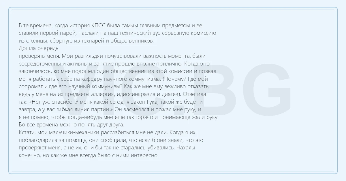 В те времена, когда история КПСС была самым главным предметом и ее ставили первой парой, наслали на наш технический вуз серьезную комиссию из столицы, сборную из технарей и общественников. Дошла очередь проверять меня. Мои разгильдяи почувствовали важность момента, были сосредоточенны и активны и занятие прошло вполне прилично. Когда оно закончилось, ко мне подошел один общественник из этой комиссии и позвал меня работать к себе на кафедру научного коммунизма. (Почему? Где мой сопромат и где его научный коммунизм? Как же мне ему вежливо отказать, ведь у меня на их предметы аллергия, идиосинкразия и диатез). Ответила так: «Нет уж, спасибо. У меня какой сегодня закон Гука, такой же будет и завтра, а у вас гибкая линия партии.» Он засмеялся и пожал мне руку, и я не помню, чтобы когда-нибудь мне еще так горячо и понимающе жали руку. Во все времена можно понять друг друга. Кстати, мои мальчики-механики расслабиться мне не дали. Когда я их поблагодарила за помощь, они сообщили, что если б они знали, что это проверяют меня, а не их, они бы так не старались-убивались. Нахалы конечно, но как же мне всегда было с ними интересно.