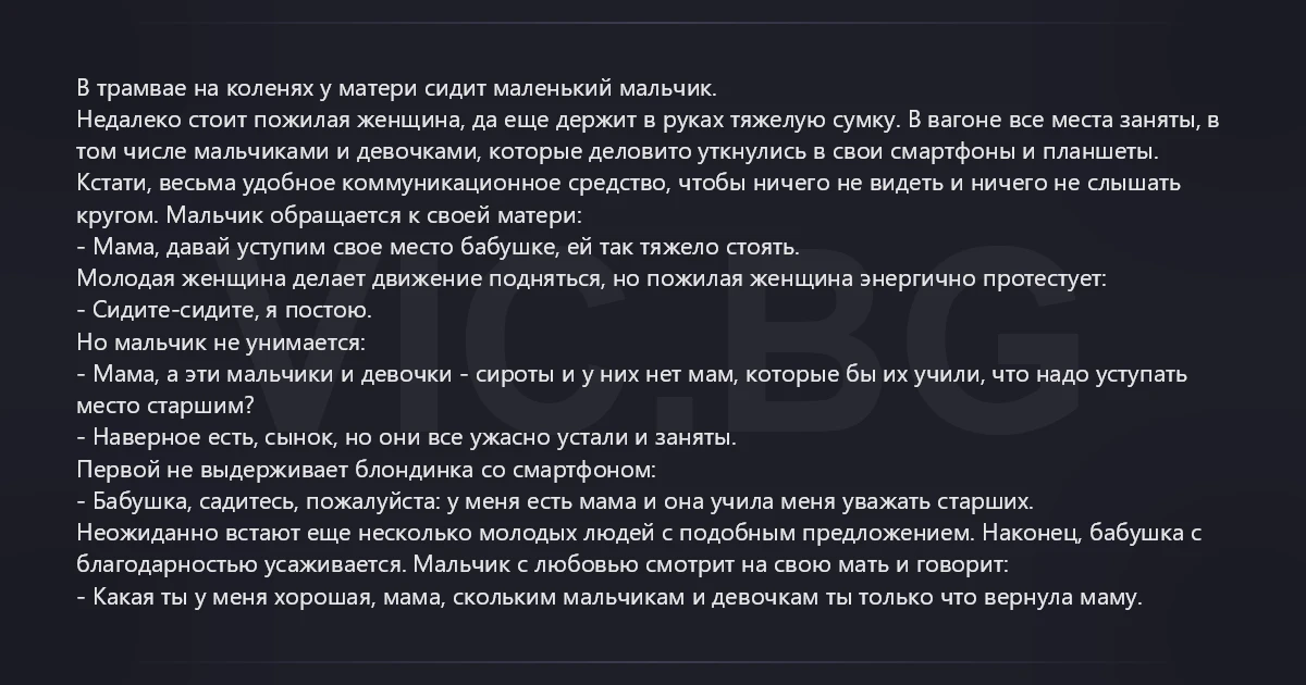 В трамвае на коленях у матери сидит маленький мальчик. Недалеко стоит пожилая женщина, да еще держит в руках тяжелую сумку. В вагоне все места заняты, в том числе мальчиками и девочками, которые деловито уткнулись в свои смартфоны и планшеты. Кстати, весьма удобное коммуникационное средство, чтобы ничего не видеть и ничего не слышать кругом. Мальчик обращается к своей матери: - Мама, давай уступим свое место бабушке, ей так тяжело стоять. Молодая женщина делает движение подняться, но пожилая женщина энергично протестует: - Сидите-сидите, я постою. Но мальчик не унимается: - Мама, а эти мальчики и девочки - сироты и у них нет мам, которые бы их учили, что надо уступать место старшим? - Наверное есть, сынок, но они все ужасно устали и заняты. Первой не выдерживает блондинка со смартфоном: - Бабушка, садитесь, пожалуйста: у меня есть мама и она учила меня уважать старших. Неожиданно встают еще несколько молодых людей с подобным предложением. Наконец, бабушка с благодарностью усаживается. Мальчик с любовью смотрит на свою мать и говорит: - Какая ты у меня хорошая, мама, скольким мальчикам и девочкам ты только что вернула маму.