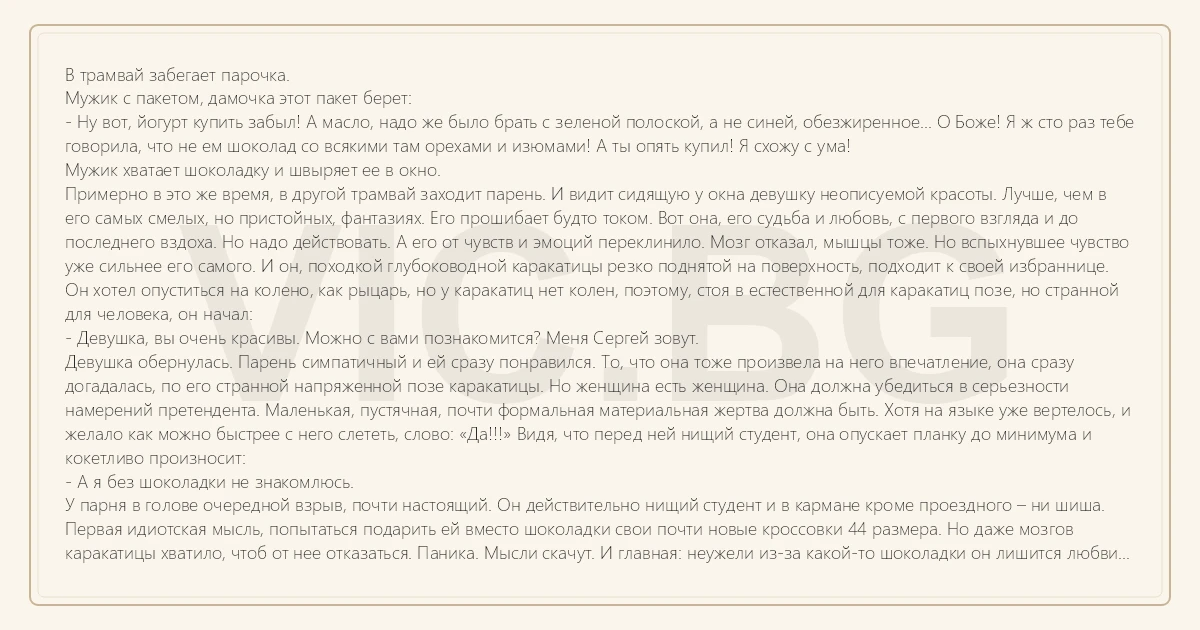 У парня в голове очередной взрыв, почти настоящий. Он действительно нищий студент и в кармане кроме проездного – ни шиша. Первая идиотская мысль, попытаться подарить ей вместо шоколадки свои почти новые кроссовки 44 размера. Но даже мозгов каракатицы хватило, чтоб от нее отказаться. Паника. Мысли скачут. И главная: неужели из-за какой-то шоколадки он лишится любви всей своей жизни и будет обречен на вечные страданья и муки. Он не знает что предпринять. Он в смятении. Он мысленно кричит: Помогите!!! Пожалуйста помогите!!! Мимо проносится встречный трамвай и в окно влетает шоколадка с орехами и изюмом. Ударившись парню в грудь, она падает девушке на колени.