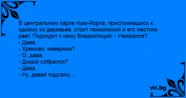 В центральном парке Нью-Йорка, прислонившись к одному из деревьев, стоит темнокожий и его жестоко рвет. Подходит к нему бледнолиций: - Нажрался?